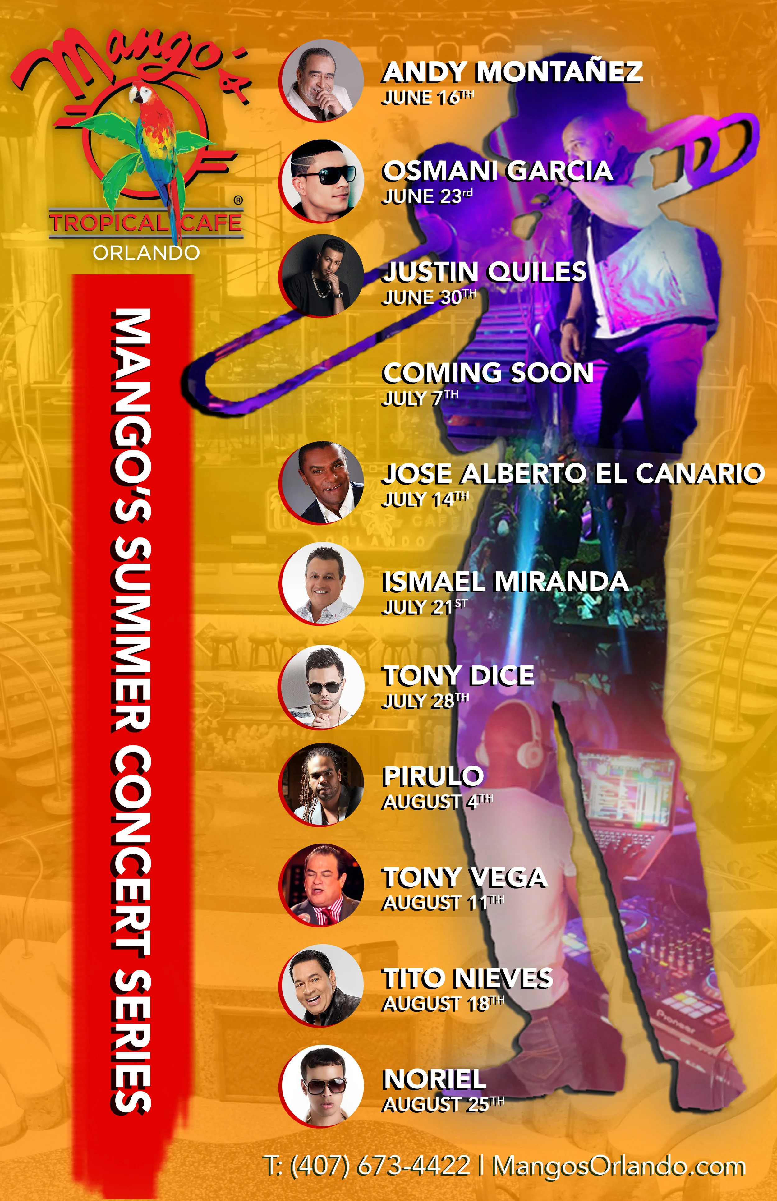 Orlando – Hot nightclub Mango's Tropical Cafe will host 11 concerts on Friday nights this summer. Among the headliners are Andy Montañez, Justin Quiles, and Tony Vega. The full schedule is below. Tickets from $25. Doors open at 9:30pm and shows start 11pm. Tickets