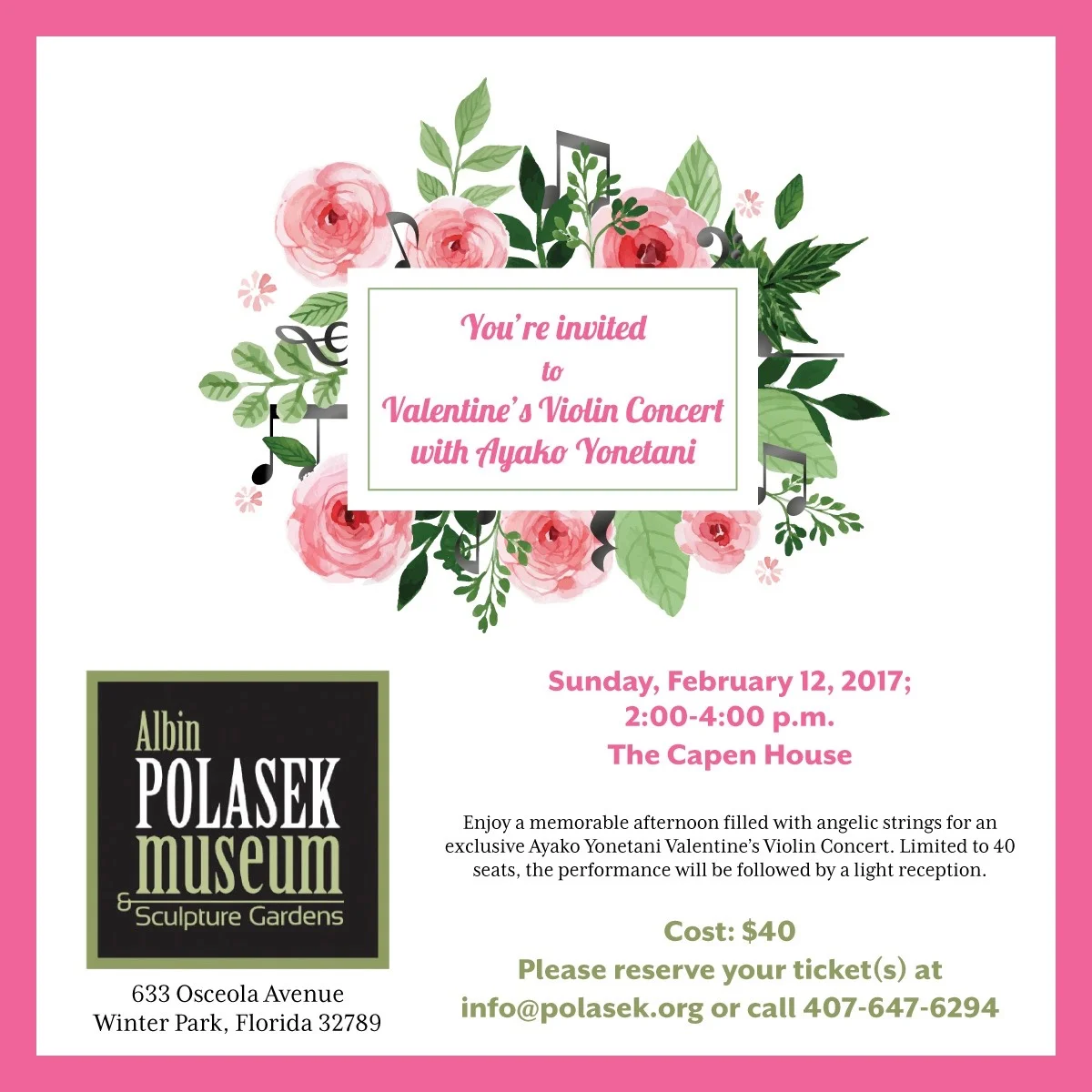 Orlando -- Winter Park's indoor-outdoor sculpture destination, the Albin Polasek Museum & Sculpture Gardens, will host a violin concert featuring Ayako Yonetani. Only 40 tickets will be sold, and a "light reception" will follow. $40. Tickets: 407.647.6294 or info@polasek.org