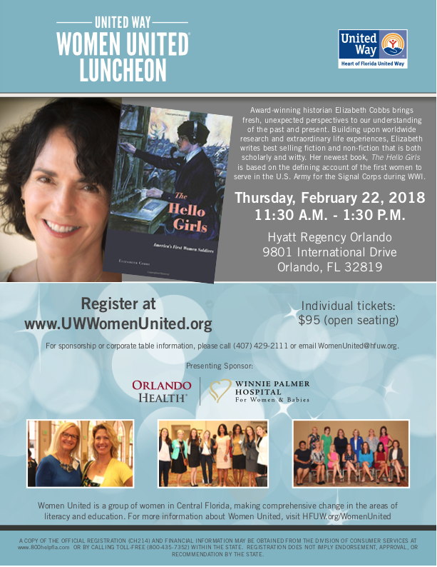 Orlando -- Author and historian Dr. Elizabeth Cobbs will be the keynotes speaker of the United Way Women United Luncheon. This annual gathering is perhaps the networking event for Orlando's females. Professionals, as well as others eager to learn, gather for an informative speech and to meet or re-meet one another while learning about the ways United Way of Central Florida helps residents in need.