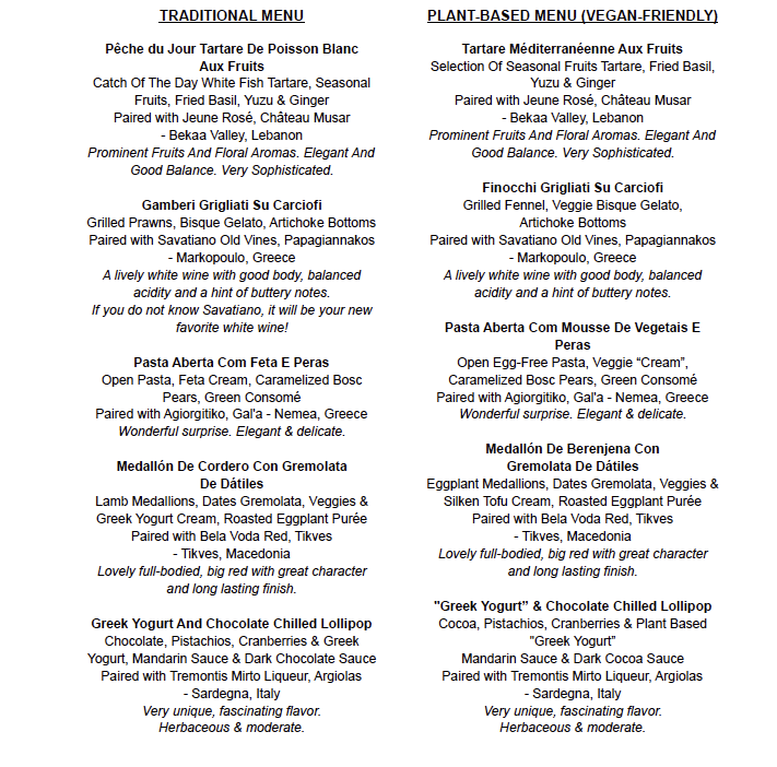 Orlando—The cozy Winter Park wine bar-slash-restaurant Vinia now offers five-course meals on select nights. This coming weekend, look for a Mediterranean-inspired theme. We’re talking fish tartare, prawns with artichokes, pasta with feta and pears, and lamb medallions. The regular and plant-based menus and wines are below.