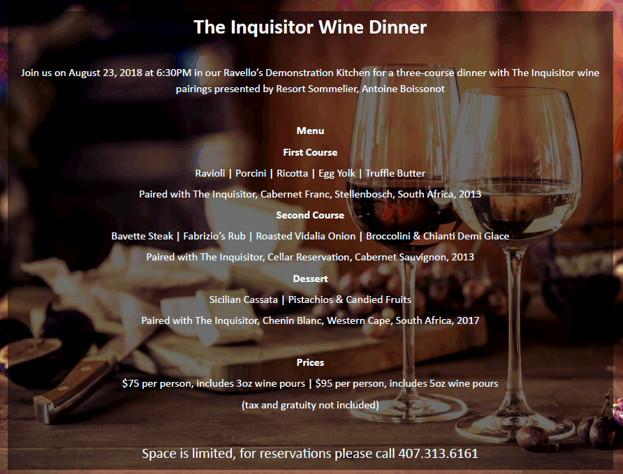 Orlando – The Inquisitor wines will be featured during a three-course tasting dinner in the intimate Demonstration Room of Ravello, an Italian restaurant at the Four Seasons Orlando. The resort's sommelier, Antoine Boissonot, will talk about each wine as the courses are served: porcini-ricotta ravioli, steak with a chianti demi-glace, and a dessert of Sicilian cassata with pistachios and candied fruit. $75 with 3-ounce wine pours, $95 with 5-ounce wine pours. Tax and tip are extra. Reservations: 407.313.6161